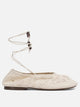Ballerine "Rosemary" Alohas, costruite con una lavorazione in crochet di cotone, presentano una struttura leggera e flessibile. La tomaia a trama aperta favorisce la traspirabilità del piede. Lacci sottili avvolgono la caviglia e includono finiture con perline in legno. La silhouette è essenziale, con scollo elasticizzato per una vestibilità adattabile. Il sottopiede è in pelle, mentre la suola in gomma assicura appoggio stabile e comfort quotidiano.