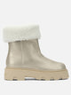 Stivaletti "Aurea" in shearling Moncler, realizzati in pelle scamosciata e montone a pelo lungo. La tomaia in shearling presenta una costruzione voluminosa con profilo regolare. L'interno è rivestito in pelle di pecora a pelo lungo per maggiore isolamento termico. La suola esterna, realizzata in TPU con imbottitura in EVA, è abbinata a un guardolo in pelle. Silhouette dinamica con volume accentuato e struttura stabile.