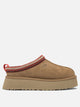 Slipper "Tazz II" Ugg con struttura costruita su plateau leggero di 4,4 cm, tomaia in camoscio liscio e profilo in tessuto realizzato in fibre di poliestere riciclato. Fodera in montone da 10 mm abbinata a soletta interna in montone, completata da suola in EVA derivata da canna da zucchero con forma convessa. Tirante posteriore integrato e UGGbraid applicato lungo il bordo superiore. Logo Ugg stampato a caldo in rilievo.