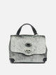Borsa a mano "Postina" baby Zanellato, costruita in pelle metallizzata a scaglie, presenta una struttura compatta e rigida. La patta superiore è chiusa da una doppia chiusura a girello in metallo con finitura argento. Il manico superiore in pelle, associato a una tracolla regolabile e rimovibile, garantisce portabilità e versatilità d'uso. Gli elementi in metallo rifiniscono i lati e la base con borchie e piedini protettivi, mentre le finiture sono in pelle liscia tono su tono.