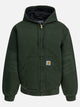 Carhartt WIP "OG Active" jacket with polyester construction and polyester inner padding. The silhouette is defined by the adjustable drawstring hood and full-length central zipper closure. Patch front pouch pockets, visible seams along the hem and contoured panels contribute to the garment's construction. The surface has a smooth, compact finish with functional details and integrated structural elements.