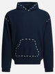 Kapital "Marionette" hoodie with soft construction made of medium-weight cotton. Construction features long sleeves, integrated hood and regular silhouette. Contrasting decorative stitching is featured along the edge of the hood, on the sleeves and around the front pocket. Patch pouch pocket provides functional space, while cuffs and hem are finished in stretch rib for added hold.