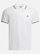 Cotton pique polo shirt with Moncler logo patch, featuring a compact construction and durable fabric details. The garment features a defined silhouette with a classic collar and front closure using mother-of-pearl buttons. Tricolor inserts are applied at the sleeve and collar edges, integrating distinctive elements into the profile. The main fabric uses piqué-knit cotton yarn, defining the texture and tightness of the surface.