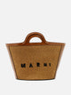 Marni "Tropicalia" handbag made of leather and raffia-effect fabric panels. Rigid structure with compact silhouette, reinforced leather bottom. Short handles with embossed details, leather top closure. Shoulder strap, attached by metal snap hooks, is detachable and adjustable. Marni logo is embroidered on the front. The metal elements feature a gold finish.