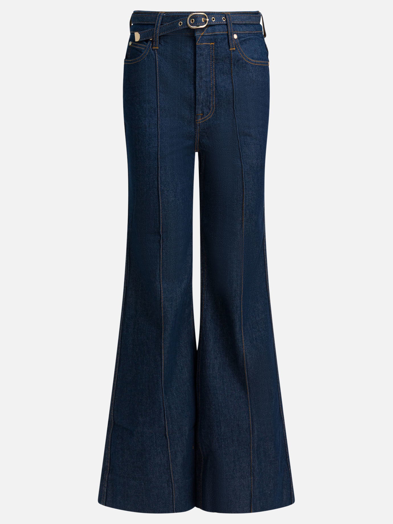 Zimmermann wide-leg jeans made of softly structured denim feature a wide straight silhouette from waist to hem. A coordinating belt in identical fabric runs through the belt loops, adjusting the fit in front. Construction features contrast stitching and flat topstitching along the main lines. Inserted side pockets follow the horizontal cut, with back featuring patch pockets.